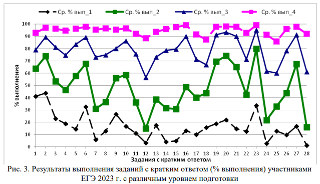 Добрый день, уважаемые читатели! У меня возникла мысль узнать, насколько хорошо искусственный интеллект умеет решать задачки первой части ЕГЭ по химии. Давайте посмотрим на статистику, на которой показано, какой процент школьников с разным уровнем подготовки справляется с задачами первой части: Видно, что сильные ребята легко справляются практически со всеми заданиями первой части, а вот у ребят, подготовленных чуть хуже, трудности вызывают вполне определённые номера. Давайте будем ориентироваться на 3 группу - это экзаменуемые с хорошей подготовкой (первичный балл: 30–45; тестовый балл: 61–81). Определим эти номера по графику: на соответствующей синей кривой характерный процент выполнения заданий сильно проседает в номерах 4, 7, 8, 12, 17, 18, 22, 24, 25, 28. По этим заданиям и будем определять уровень подготовки нашего искусственного интеллекта. Для хоть какой-нибудь статистики будем решать не по одному номеру, а например, по 20. Варианты заданий будем брать из открытого банка задани
