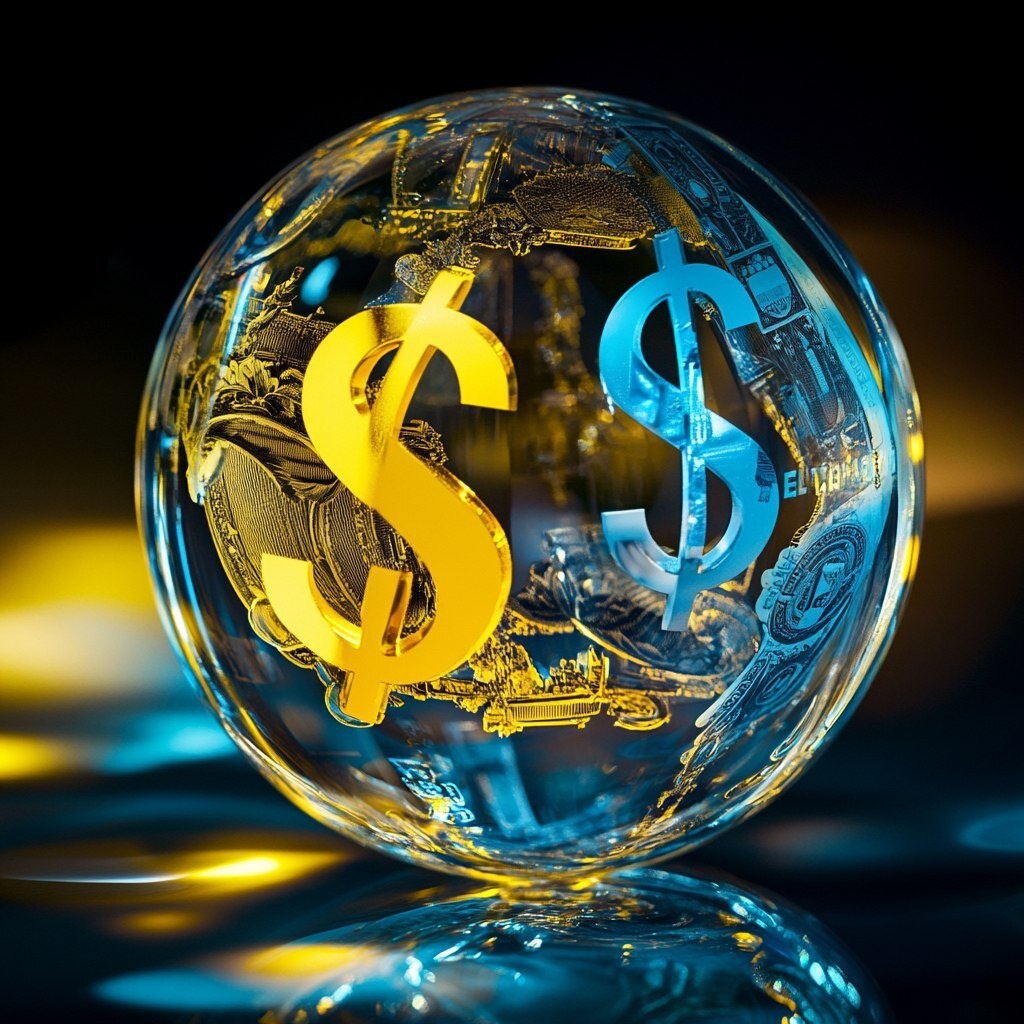 Создано на основе запроса: a globe made of blue an yellow glass with the dollar , euro, pound symbols on it