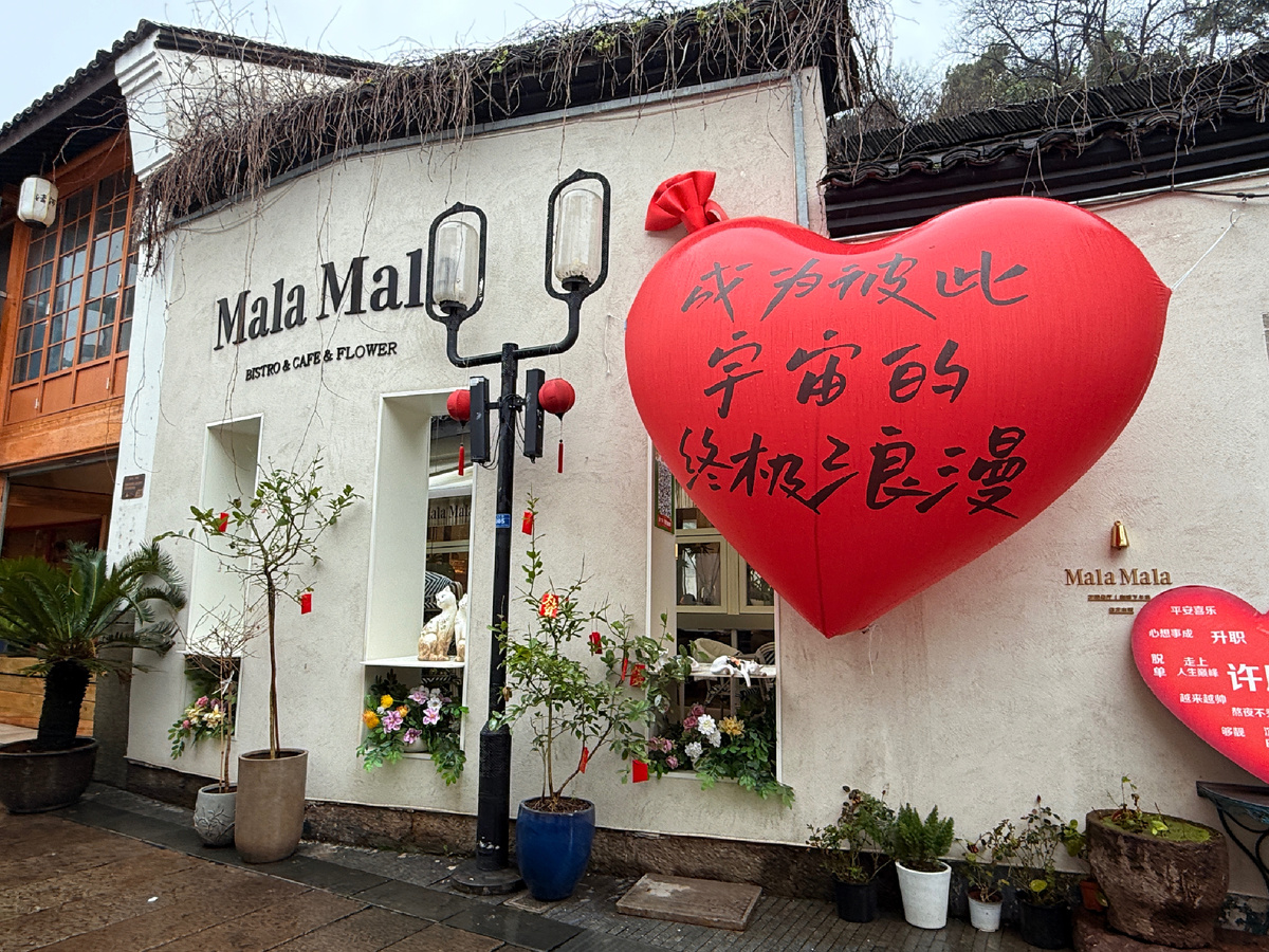 Грешна - люблю посидеть в красивых кафе, трачу на это время и деньги, но это доставляет мне удовольствие. А как жить без приятностей?! Вот в Ханчжоу еще в первый вечер заприметила интересно оформленное кафе. И когда выдалось время зашла туда выпить кофе. Называется заведение Mala Mala, не знаю, что это значит. Кафе издалека привлекает внимание большим сердцем на фасаде, потом глаз падает на котиков в окне, потом на цветы и хочется зайти внутрь. Заходишь, а там все красивое! Очень много цветов, заведение делает букеты, при мне курьеры несколько раз забирали готовые композиции. На каждом столе стоит несколько букетов разного размера, и в разных уголках кафе живые цветы. Красиво, романтично и ароматно. Цветы очень украшают место. Оформлено все в стиле роскошной эклектики: хрустальные люстры, красивая посуда, мягкие диваны, деревянные столы, вазочки, подсвечники, и всякие симпатичные предметы декора. Можно посидеть внутри кафе или во дворике (в мой визит погода к этому не располагала)