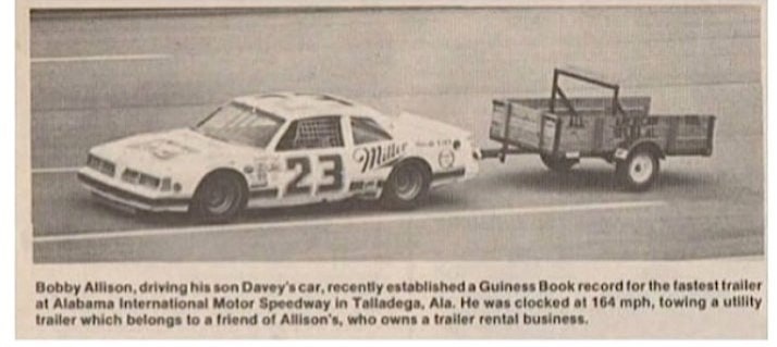 41 год назад Бобби Эллисон, действующий чемпион Кубка, на автомобиле АРКА вместе с прицепом проехал по трассе в Талладеге со скоростью 164.338 мили в час, установив новый рекорд для прицепа. Ему удалось совершить несколько кругов, прежде чем у прицепа лопнула покрышка.