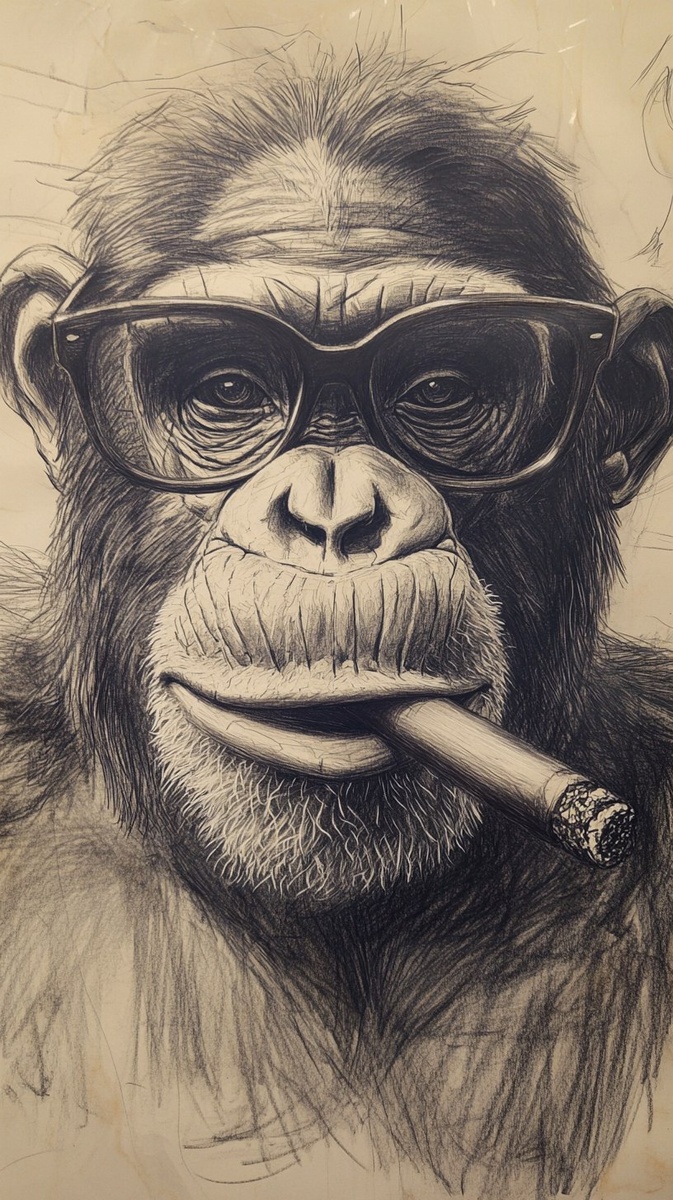 Создано на основе запроса: A hand-drawn sketch of an ape wearing glasses and smoking a cigar