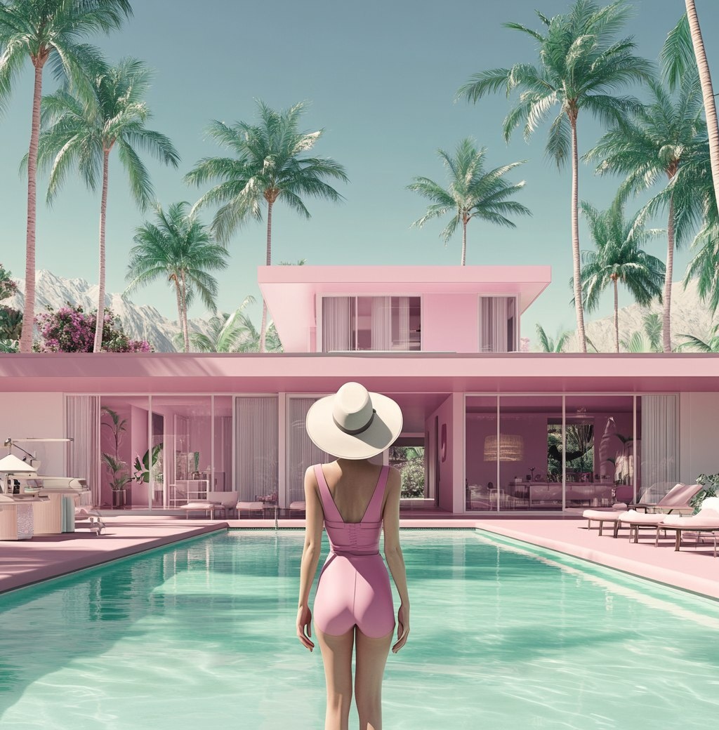 Создано на основе запроса: Palm Springs, soft pink and white tones, tropical architecture, a woman in front of a pool wearing a hat, surrounded by palm trees, soft pastel colors, photorealistic.