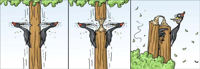 В дремучем лесу жили два товарища: дятел Тук-Тук, который считал себя архитектором с клювом, и бобёр Зубастик – главный зубоскал на всю округу. Решили они дом построить, да не абы как, а из самого модного материала – бруса! "Я буду делать технологические отверстия!" – напыщенно заявил дятел, воображая себя инженером. "А я буду производить высокоточную обработку древесины!" – не остался в долгу бобёр, размахивая своими клыками. Начали они строить. Тук-Тук так увлекся "технологическими отверстиями", что каждый брус превратился в швейцарский сыр. А Зубастик от усердия обточил брёвна до состояния спичек – дом получился такой тонкий, что его можно было сдуть одним чихом! К вечеру дом стоял, но такой кривой, что даже пьяная белка не смогла бы в нём жить. А когда дело дошло до крыши, дятел пробил потолок и оказался в подвале – получился первый в лесу дом с вертикальным спуском для ленивых! "Это не дом, а произведение современного искусства!" – гордо заявил Тук-Тук, вытирая с клюва древесную