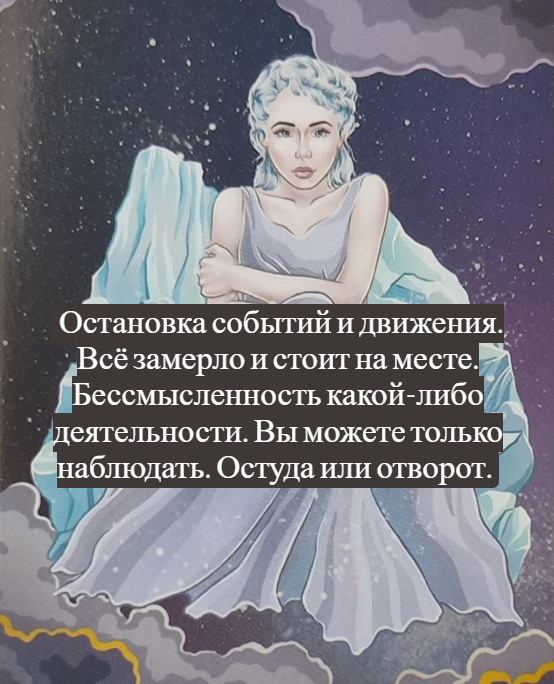 Бессмысленность какой-либо деятельности. Советует остановить её, так как результатов не будет, и смогут ли они появиться в будущем сейчас совершенно не понятно. Холодный расчёт. Участвовать в событиях и ситуациях не получится, вы можете только наблюдать за ними. Погружение в размышления или медитацию для лучшего понимания происходящего.