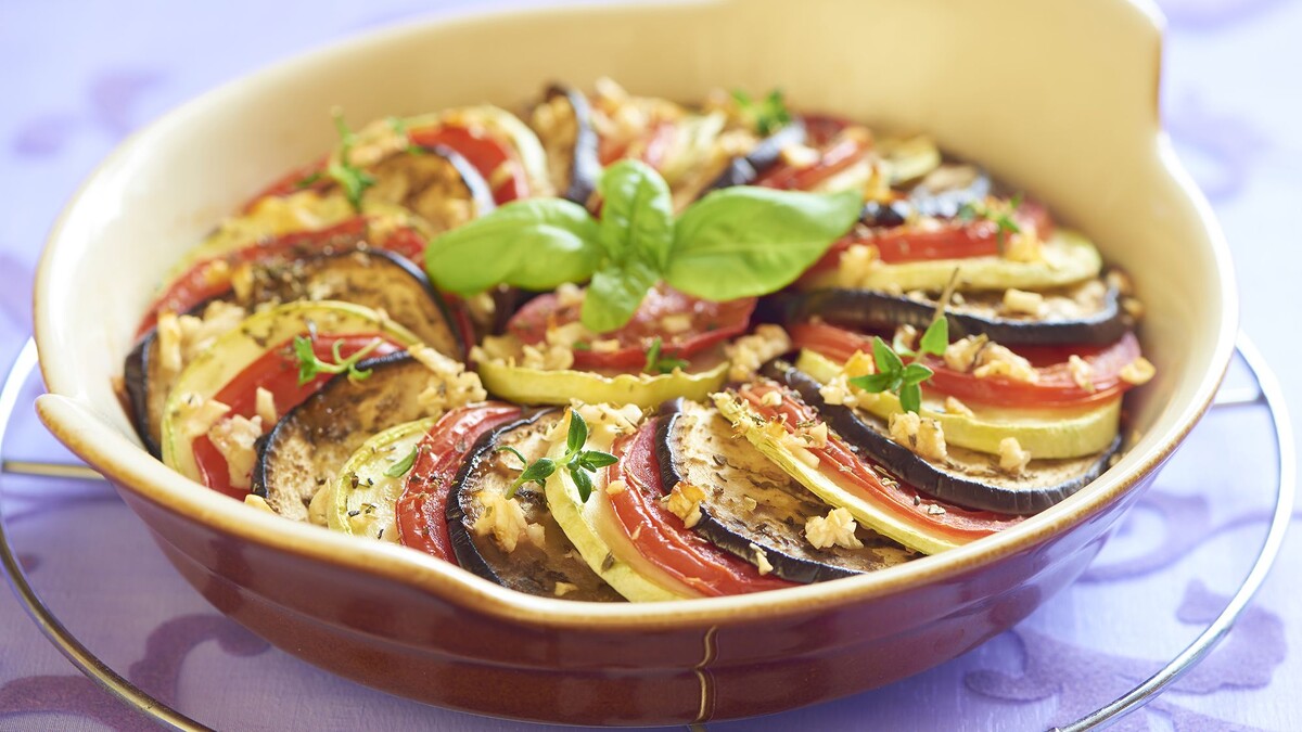- Для красивого оформления (как в мультфильме «Рататуй») выложите овощи спиралью в форму и запеките в духовке при 180°C 30–40 минут.