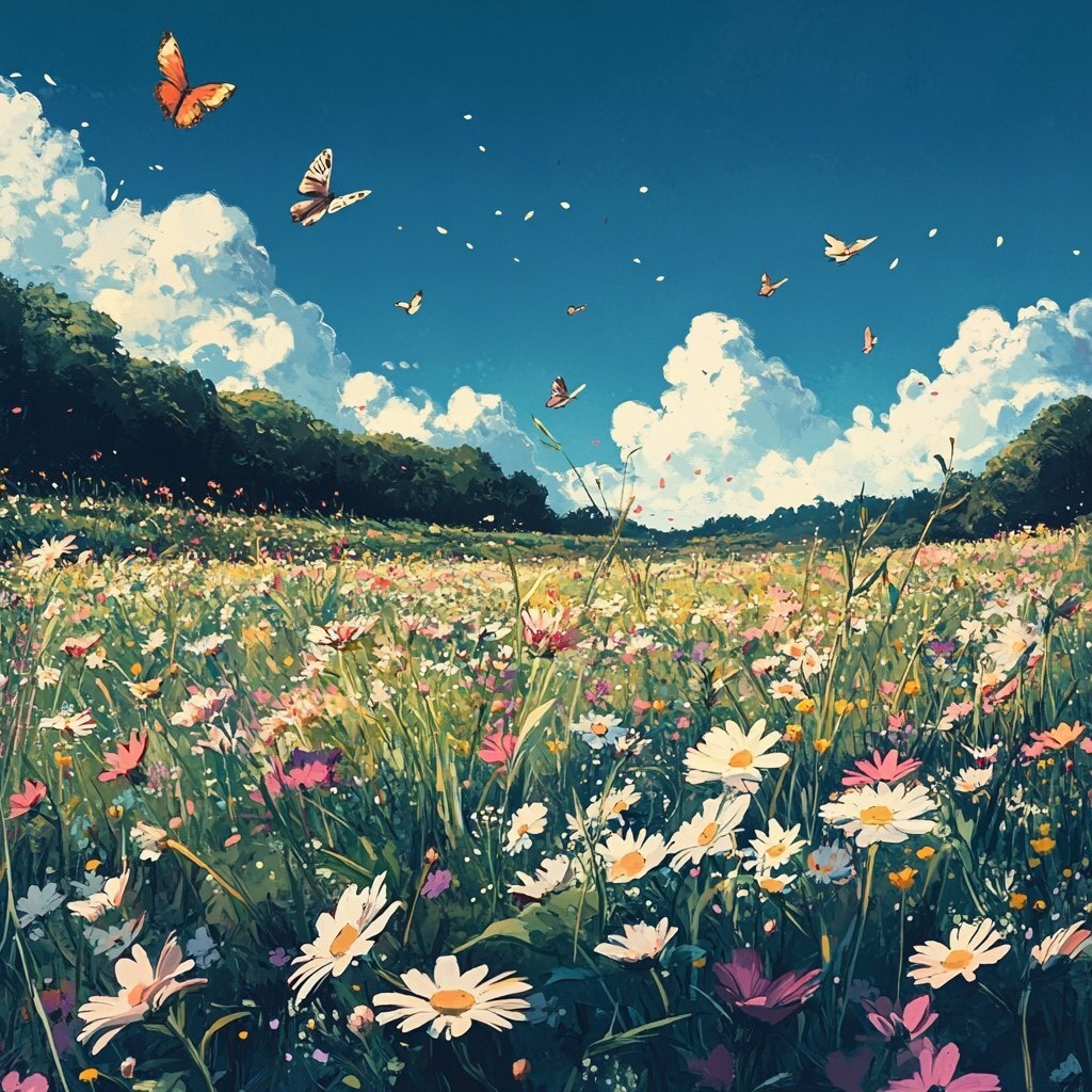 Создано на основе запроса: 90s anime art style field of wildflowers; simple sky in far off in background; birds and butterflies flying above