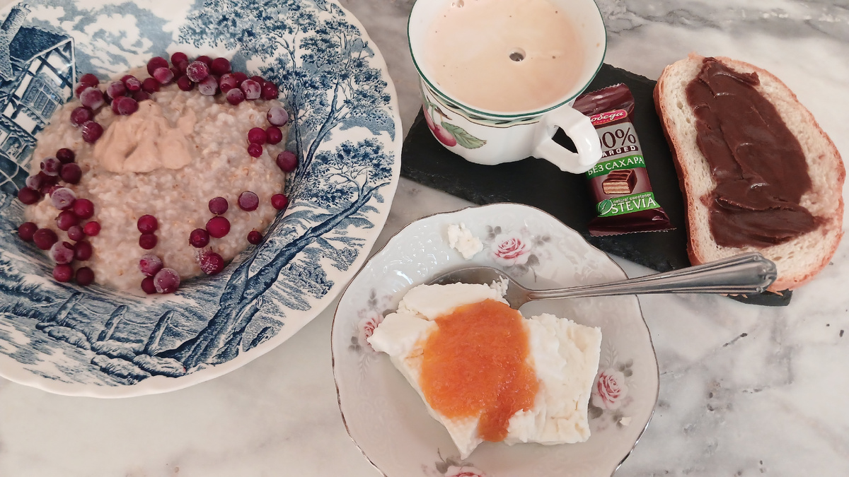 Завтракаем овсяной кашей, творогом и кофе. Овсяная каша из резаного овса, в нее добавила арахисовую пасту и бруснику. Творог пластовой из Самоката, он мне понравился даже больше, чем из Вкусвилл - совершенно не было сыворотки, не мокрый, просто отличный. К кофе бутерброд с шоколадным маслом и конфетка. На обед был готов овощной суп-пюре. В тарелку добавила соус песто и хрустящие отруби. На второе - сосиска, яйцо и овощной микс После обеда - кофепитие с сыром маасдам и конфетой😇 На ужин тушила котлетки из кролика. У моих на гарнир гречка была, я только салат ела с котлетами Меню год назад Как не потратить лишних денег в магазине