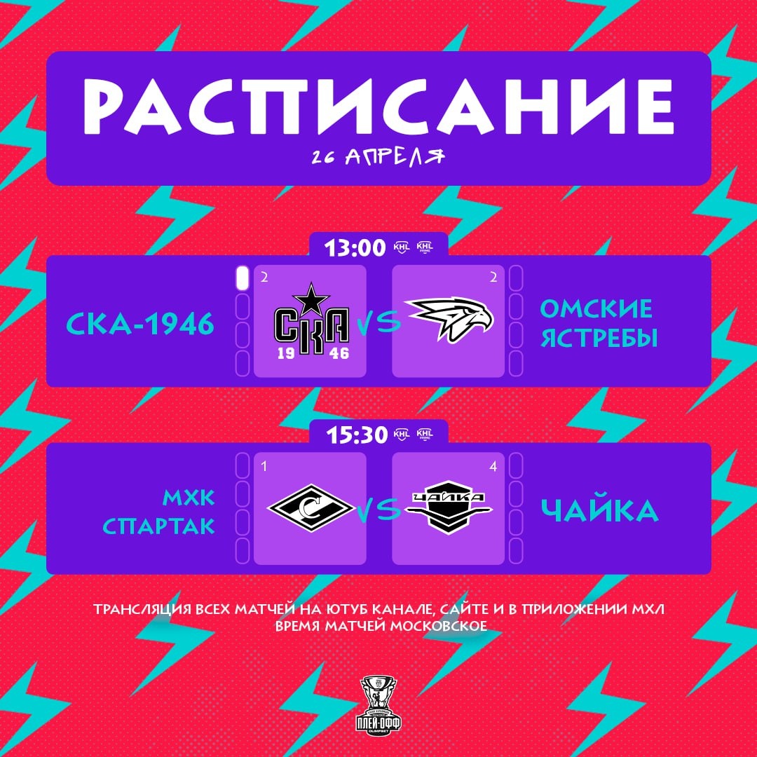 «СКА-1946» и «Омские Ястребы» сыграют второй матч, «Спартак» и «Чайка» начнут свою серию 🔥 📺 YouTube, MHL.KHL.RU, приложение МХЛ iOS | Android 🏆 @mhlrus