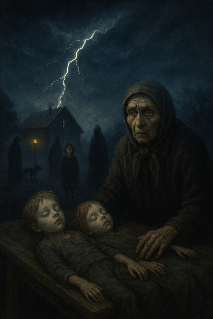 В деревне, где каждый знал каждого, жила тихая и скромная женщина — баба Шура. Всю жизнь она прожила на краю села в небольшом доме с покосившимся забором и заросшим садом. Все знали, что при первом же громе баба Шура исчезает. Кто шутя, кто всерьёз — говорили: «Шура опять в подпол нырнула». Мы, дети, тогда не понимали, что страх может быть глубже шутки, что он может зарываться в человека, как заноза в плоть, и не отпускать до конца жизни. Когда бабе Шуре было лет шестнадцать, началась та самая гроза. Тучи сгустились внезапно. Над селом словно повисла тяжелая железная плита. Воздух дрожал от электричества. Девчонка стояла у окна и наблюдала, как соседи — семья Кривцовых — собираются за обеденным столом. Мать, отец и трое детишек — все в одной комнате. Шура любила смотреть на них, они казались ей особенно дружными. Первый удар грома был настолько сильным, что с полок в доме попадала посуда. Потом — вспышка. Ослепительно белая, как будто само небо раскололось. Молния ударила прямо в крышу