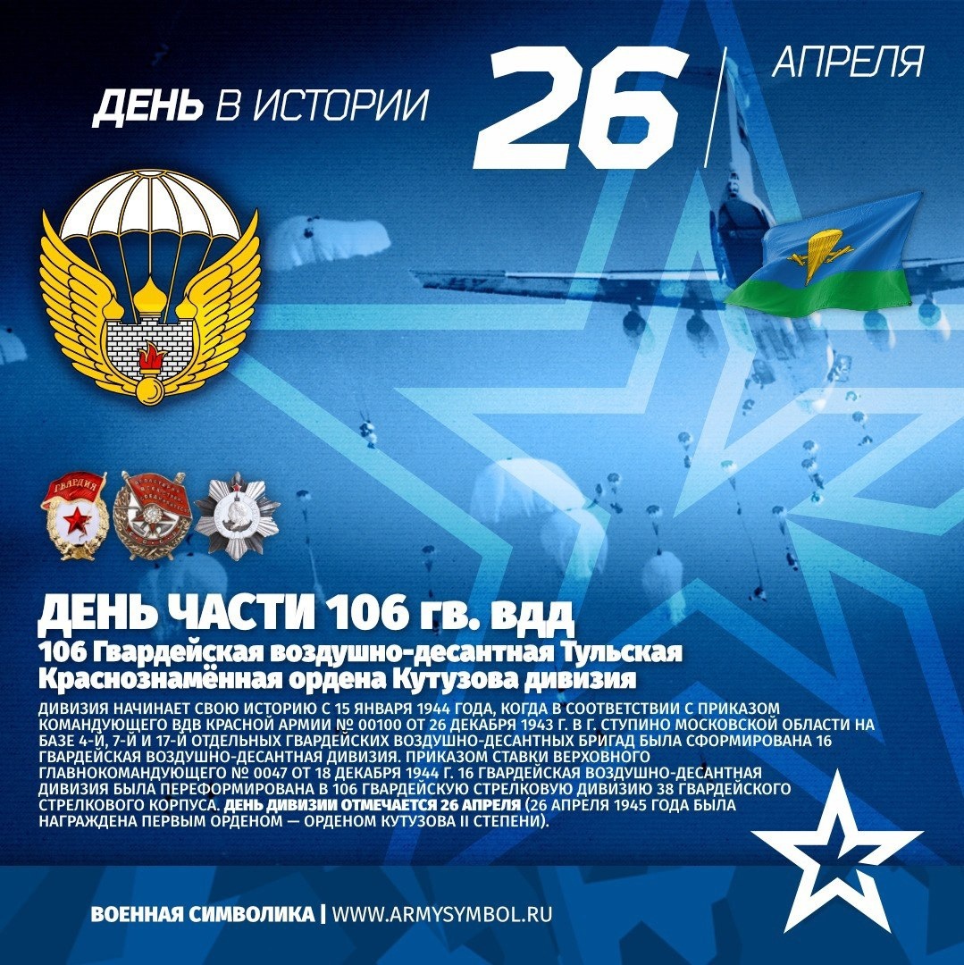 День части 106 гв. вдд 106 гвардейская воздушно-десантная Тульская Краснознамённая ордена Кутузова дивизия Ведет историю с 15 января 1944 года, когда в соответствии с приказом командующего ВДВ Красной Армии № 00100 от 26 декабря 1943 г. в г. Ступино Московской области на базе 4-й, 7-й и 17-й отдельных гвардейских воздушно-десантных бригад (бригады дислоцировались в г. Востряково, Внуково, Ступино) была сформирована 16-я гвардейская воздушно-десантная дивизия. Приказом Ставки Верховного Главнокомандующего № 0047 от 18 декабря 1944 г. 16-я гвардейская воздушно-десантная дивизия была переформирована в 106-ю гвардейскую стрелковую дивизию 38-го гвардейского стрелкового корпуса. За прорыв укреплённой полосы обороны и овладение г. Мор весь личный состав получил благодарность Верховного Главнокомандующего, а дивизия 26 апреля 1945 года была награждена первым орденом — орденом Кутузова I Показать полностью... Подпишитесь на наши группы ВКонтакте и в Одноклассниках - читайте, смотрите и ком
