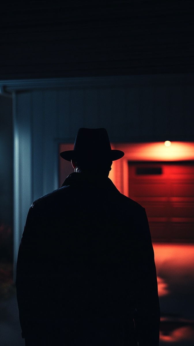 Создано на основе запроса: inpsired by the film The Devil Wears Prada, imagine a hyperrealistic 4k image of a scary man wearing a hat and hidden by the shadows, a garage in the distance