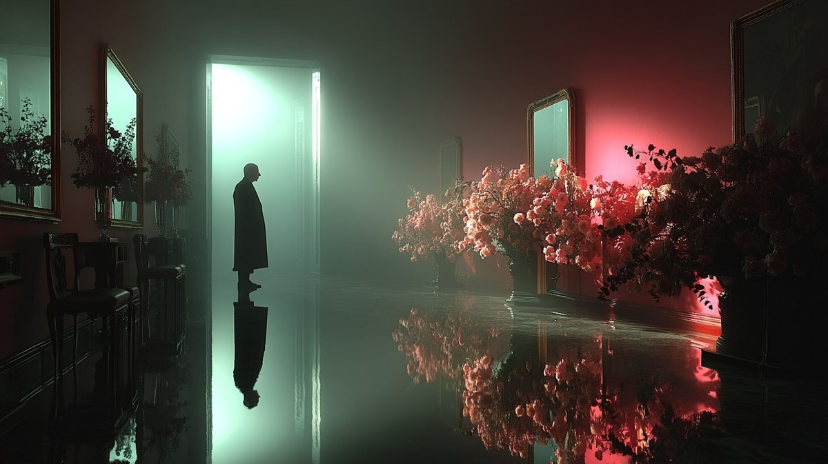 Создано на основе запроса: abstract dark surrealism, Boris Karloff standing in a funeral parlour , extreme detail, hyper realistic