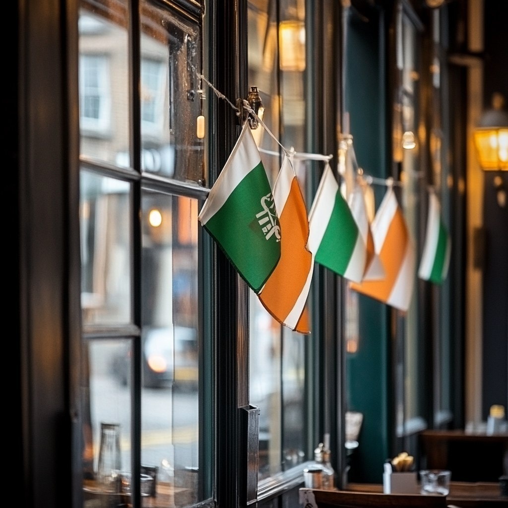 Создано на основе запроса: create an image of: Irish flags subtly hanging in a window or pub