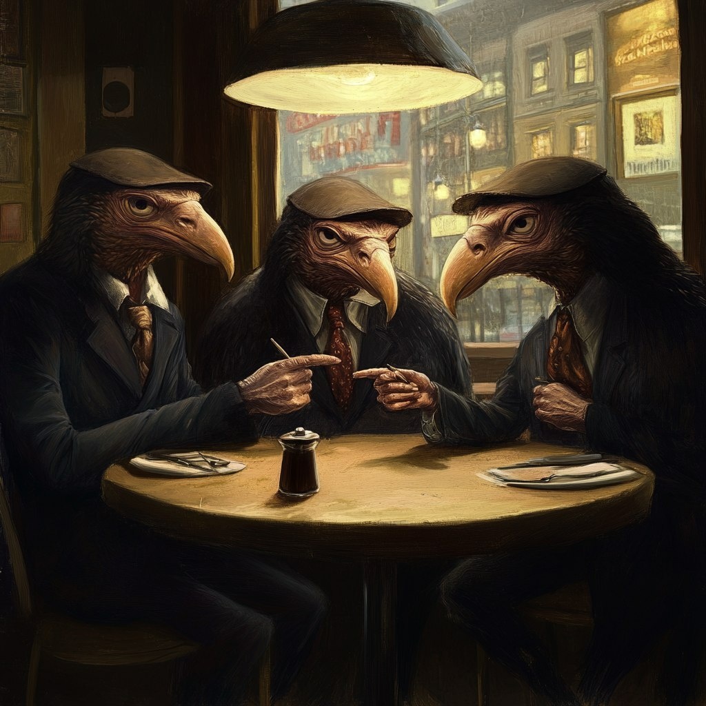 Создано на основе запроса: make 3 vultures as italian mafia, talking each other in a table of a restaurant