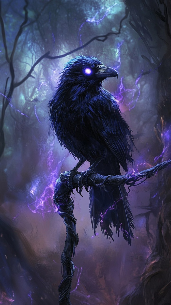 Создано на основе запроса: Dark spectral crow with shadowy feathers and glowing hollow eyes, perched on a twisted staff, haunted forest