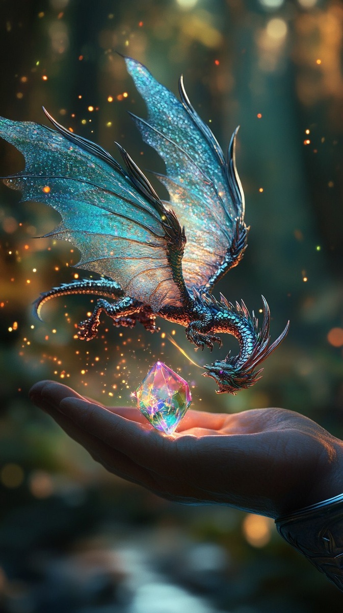 Создано на основе запроса: Tiny jewel-toned dragon with crystal-like wings, curled around a glowing gem, hovering over an adventurer’s open palm, magical sparks in the air, fantasy armor reflections, enchanted forest background