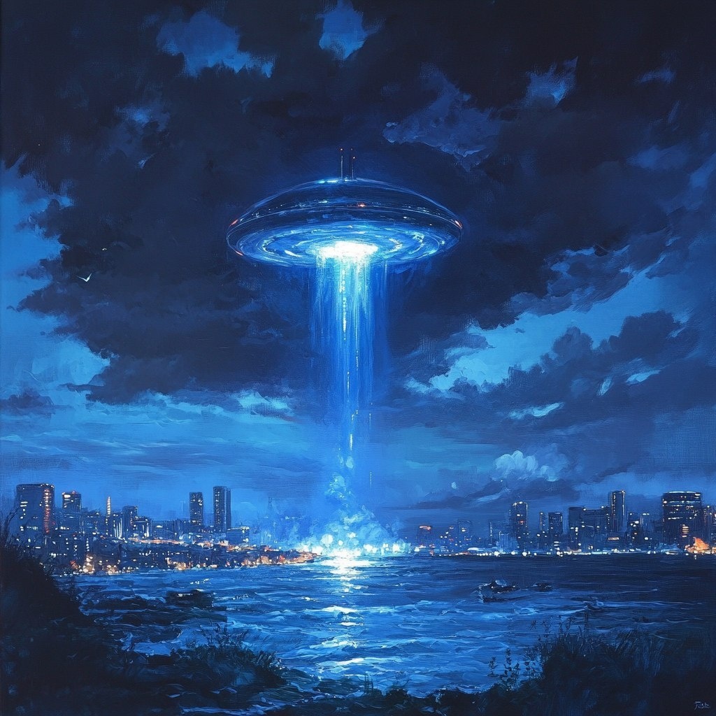 Создано на основе запроса: Japanese anime style painting, A plasma UFO appeared in the dark ocean