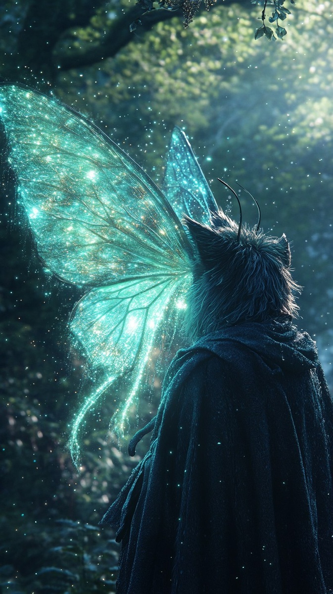 Создано на основе запроса: Floating moth-cat hybrid with glowing wings, sparkling dust trailing behind, perched on a wizard's shoulder