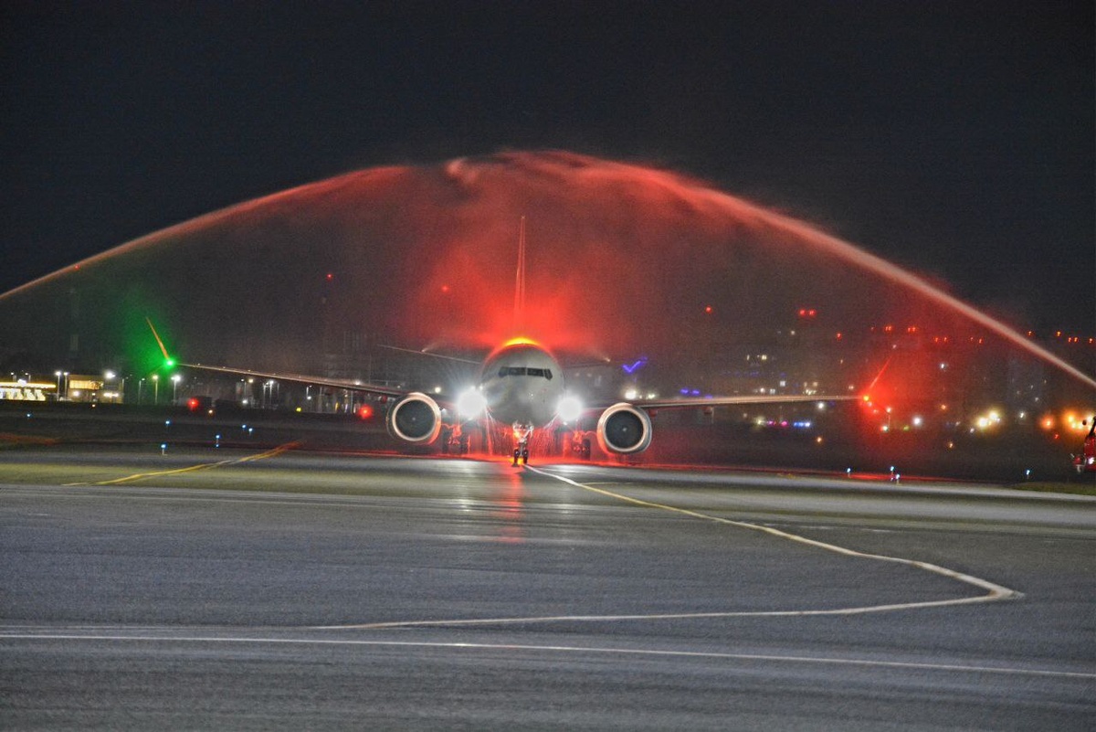 Самолет авиаперевозчика Southwind Airlines в Омске встретили традиционной водной аркой.