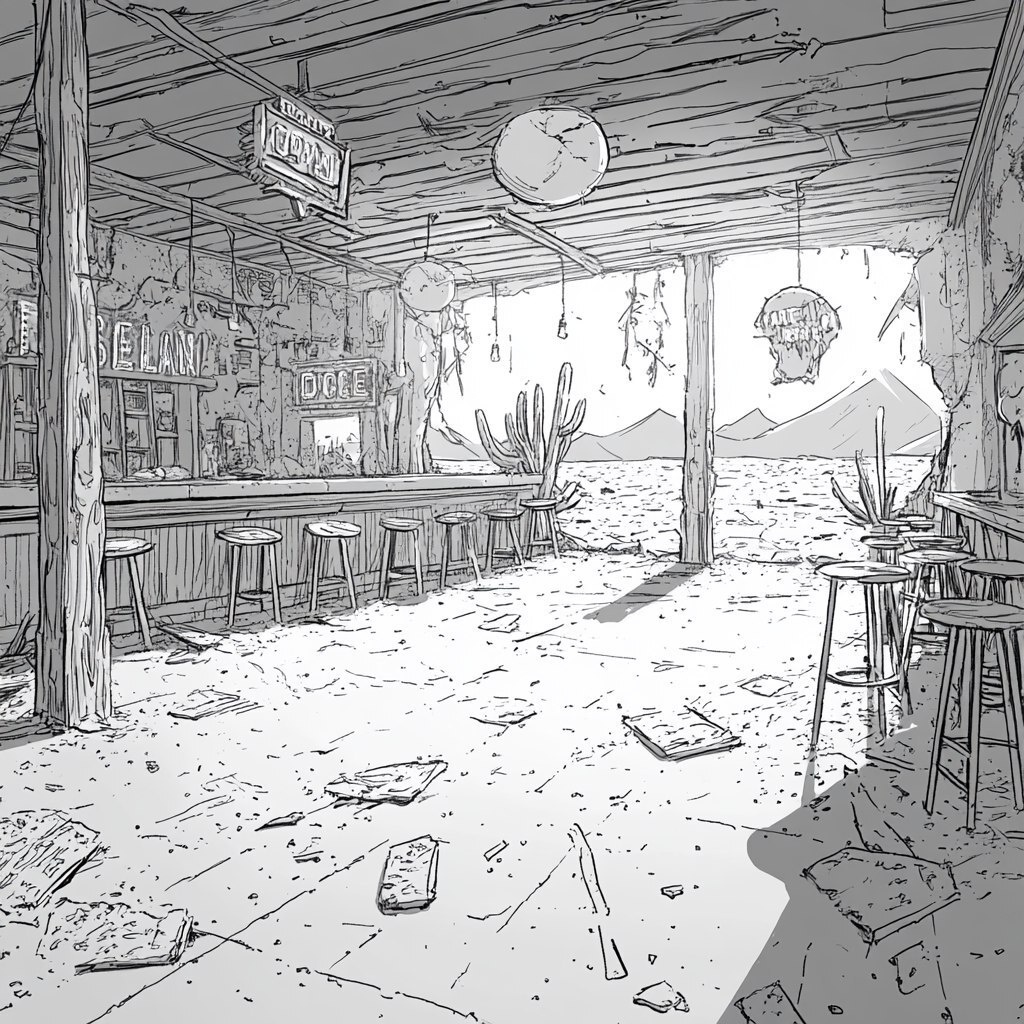 Создано на основе запроса: Loose, sketchy line art illustration of an abandoned nightclub with an old Western theme, in the middle of a dusty desert. The club looks worn down and forgotten, with broken wooden saloon doors, cracked neon signs shaped like cowboy boots and cacti, and a dusty, sand-covered dancefloor. Inside, crooked disco balls dangle from broken beams, and scattered barstools and ripped leather booths create a chaotic, abandoned feel. The sketching style is expressive and imperfect, with visible hand-drawn strokes, rough shading, and minimal crosshatching. Emphasis on texture and atmosphere rather than precision. The sunlight leaks through shattered windows, creating dramatic but loose shadow shapes. Black-and-white illustration, wide-angle view, slightly surreal and dreamlike. --- Автоперевод: Свободная, отрывочная линейная иллюстрация заброшенного ночного клуба со старой западной темой, посреди пыльной пустыни. Круто вышло? 🤔 https://dzen.ru/id/65c0c65c86e4f837c27b2