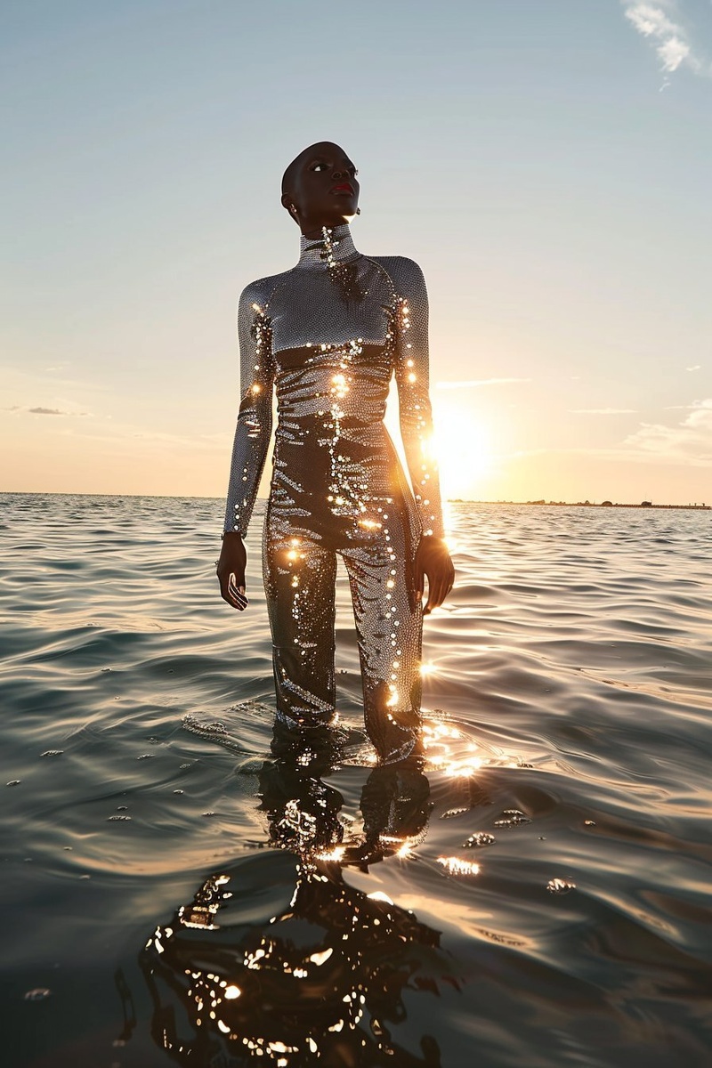 Создано на основе запроса: full body portrait of a tall Black female model standing in shallow ocean water at sunset, wearing a full-body