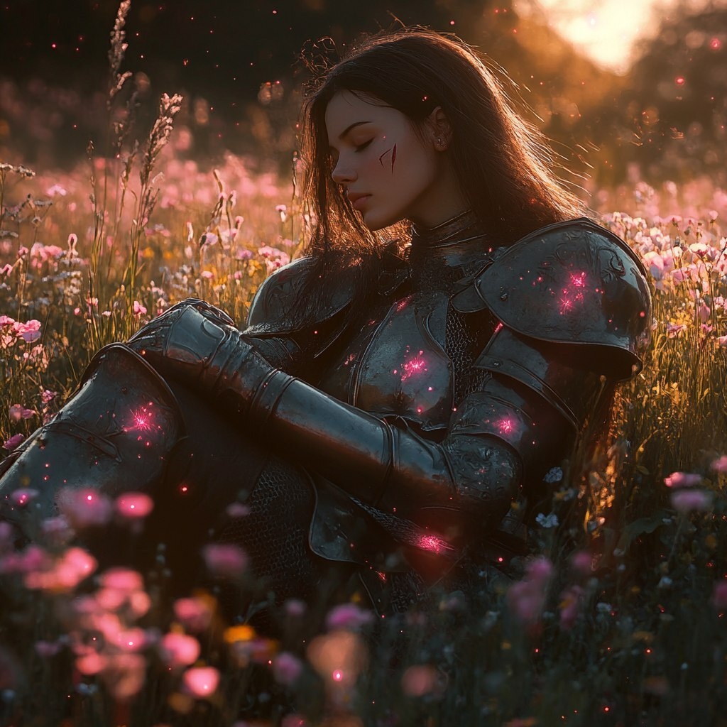 Создано на основе запроса: cinematic painterly high fantasy female knight, full armor, high contrast, dark themes, magical, strong, pink magic glitter on shiny edges, relaxing in a warm sunlit field of flowers --- Автоперевод: Кинематографическая живописная женская рыцарь, полная броня, высокая контрастность, темные темы, волшебные, сильные, розовые волшебные блеск на блестящих краях, расслабляя в теплом солнечном поле цветов. Как тебе такое изображение? 🤔 https://dzen.ru/id/65c0c65c86e4f837c27b24d7 #ИИ #AI #нейросеть #midjourney #art
