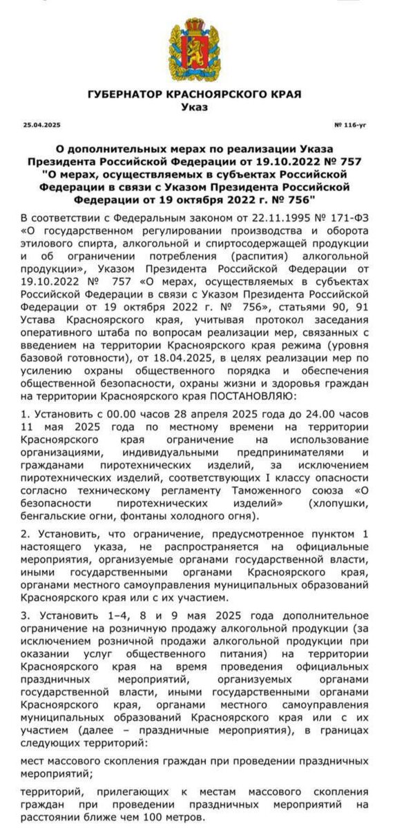 🥃❌Губернатор края Михаил Котюков подписал указ, согласно которому с 1 по 4 и 8 по 9 мая будет ограничена продажа алкоголя