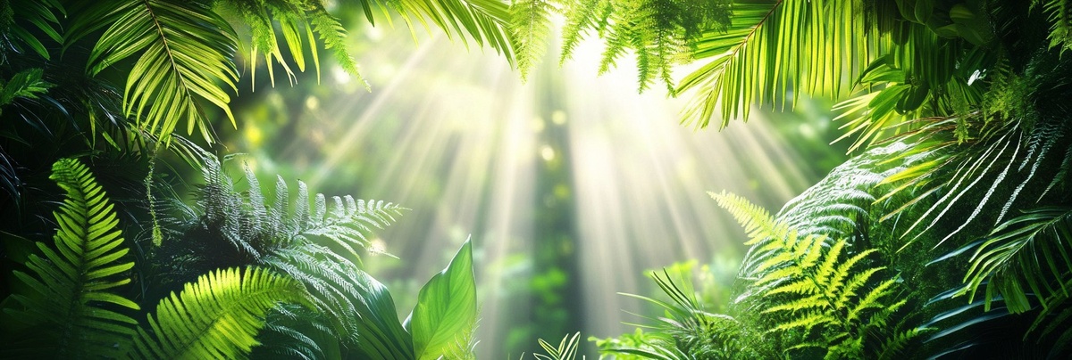 Создано на основе запроса: Lush tropical rainforest, vibrant green foliage, ferns, and palm branches, dramatic holy light streaming down