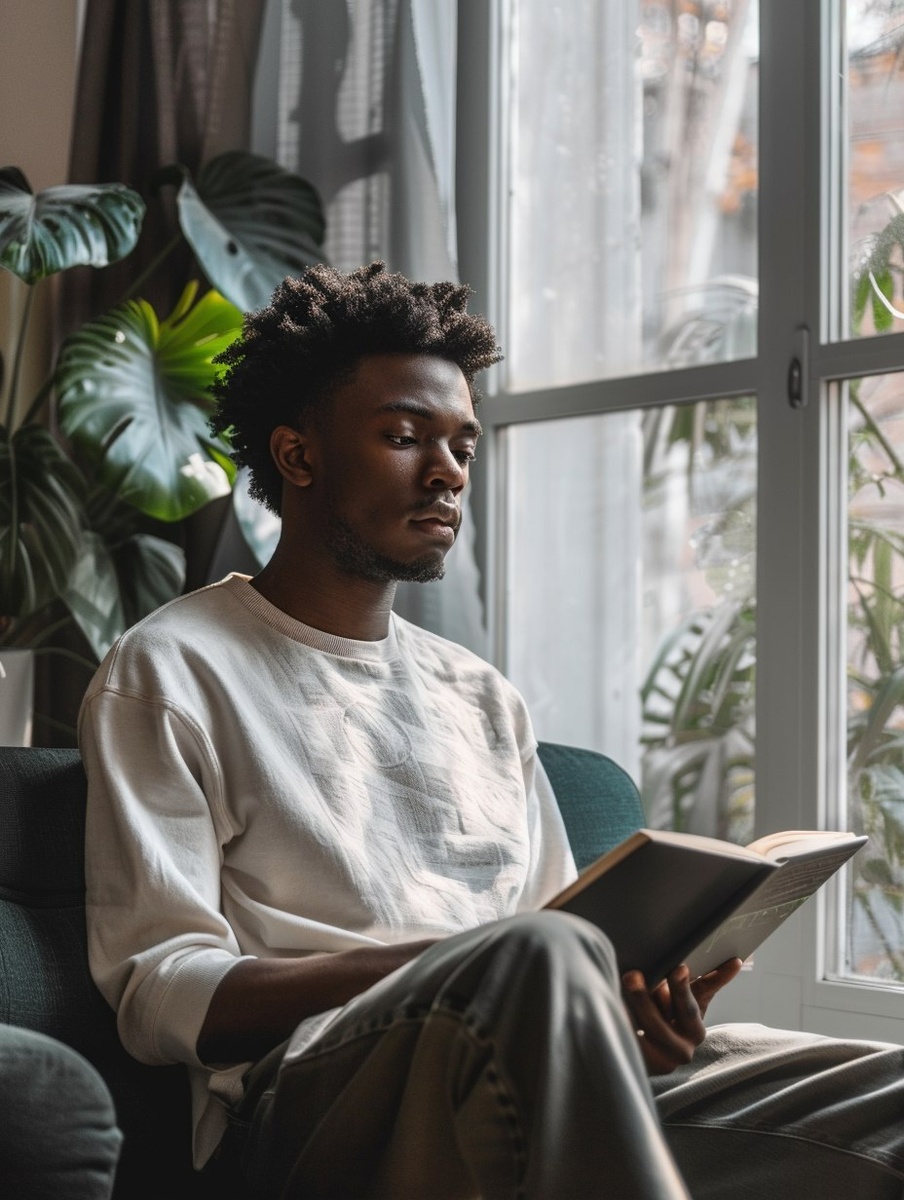 Создано на основе запроса: Young black man sitting by a large window, immersed in a book, navy and green interior tones, warm almond light