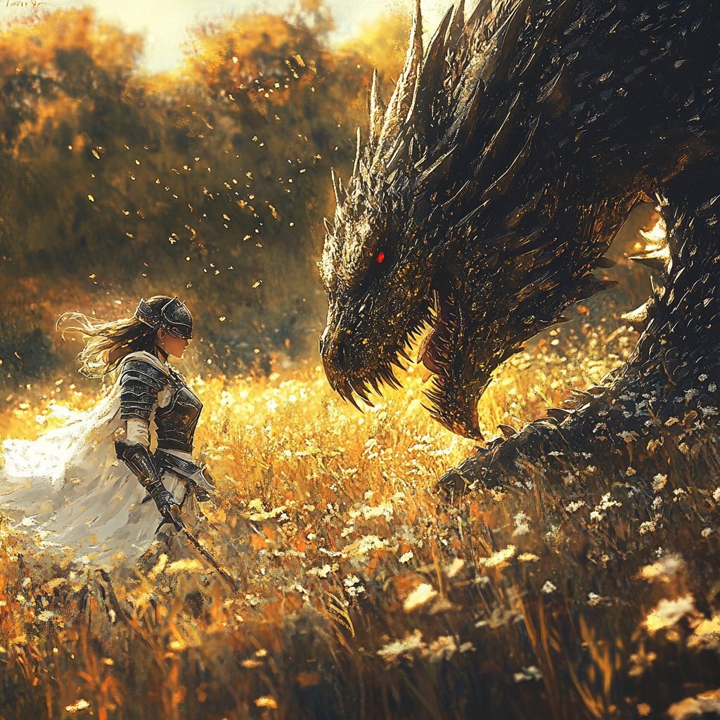 Создано на основе запроса: cinematic painterly high fantasy female knight, full armor, helmet on, high contrast, dark themes, magical, strong, gold magic glitter on shiny edges, running in a warm sunlit field of flowers, petting large scary dragon, side view --- Автоперевод: Кинематографическая живописная женская рыцарь, полная доспеха, шлем, высокий контраст, темные темы, волшебные, сильные, золотые волшебные блеск на блестящих краях, бегая в теплом солнечном поле цветов, плышит большой страшной дракон, вид сбоку Круто вышло? 🤔 https://dzen.ru/id/65c0c65c86e4f837c27b24d7 #ИИ #AI #нейросеть #midjourney #art