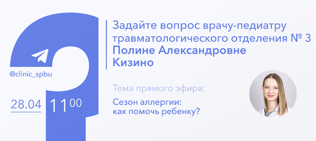 В этот понедельник, 28 апреля, в 11:00 пройдет прямой эфир с врачом-педиатром Клиники СПбГУ Кизино Полиной Александровной.