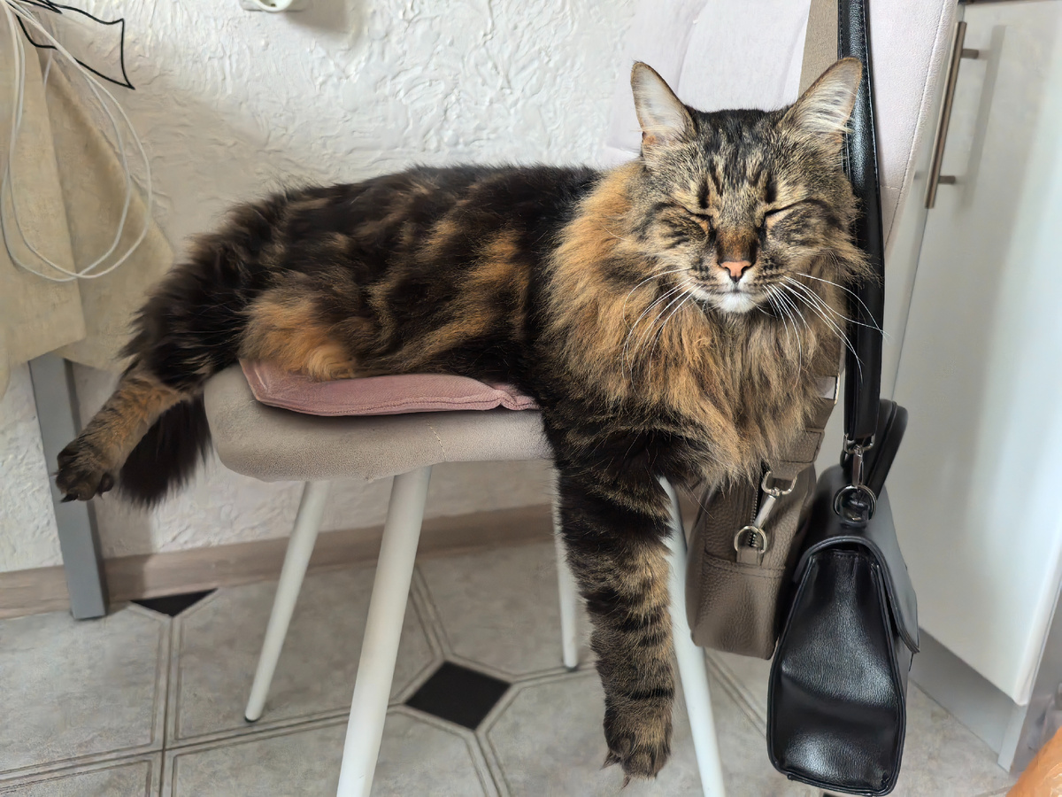 Всем привет! С вами Кузя Кусалочкин и сегодня я расскажу как хозяйка сначала меня испугала, а потом порадовала. Утро началось с паштетика, а потом я решил занять хозяйкин стул, полежать на мягеньком: Спал на диване своём, никого не трогал. Хозяин собирался на работу, рядом стояла хозяйка и стала у хозяина просить чтобы он ей денег перевёл на продукты. Сначала сказала, что холодильник и даже морозилка пустые. Но это меня не беспокоило. А вот когда хозяйка сказала, что «у кисё заканчивается мясё», то я тааак испугался, так посмотрел на хозяйку. Но денег хозяин дал и хозяйка позже сходила в магазин. Я спал на своём диванчике. Кстати, нос я всё ещё немного прикрываю. Погода у нас очень странная: то туман, то пасмурно, то солнце выйдет, то опять туман и холодно станет. Поспал и пошёл в туалет. Сделал там все дела. А хозяйка пришла убирать и обнаружила мой сюрприз. Я кое-что обронил на пол или выгреб случайно, не совсем понял. По этическим соображениям фото не выкладываю (а оно есть,