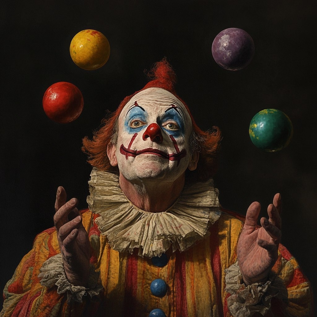 Создано на основе запроса: rodney Dangerfield dressed as a clown and juggling, photorealistic, Rembrandt lighting