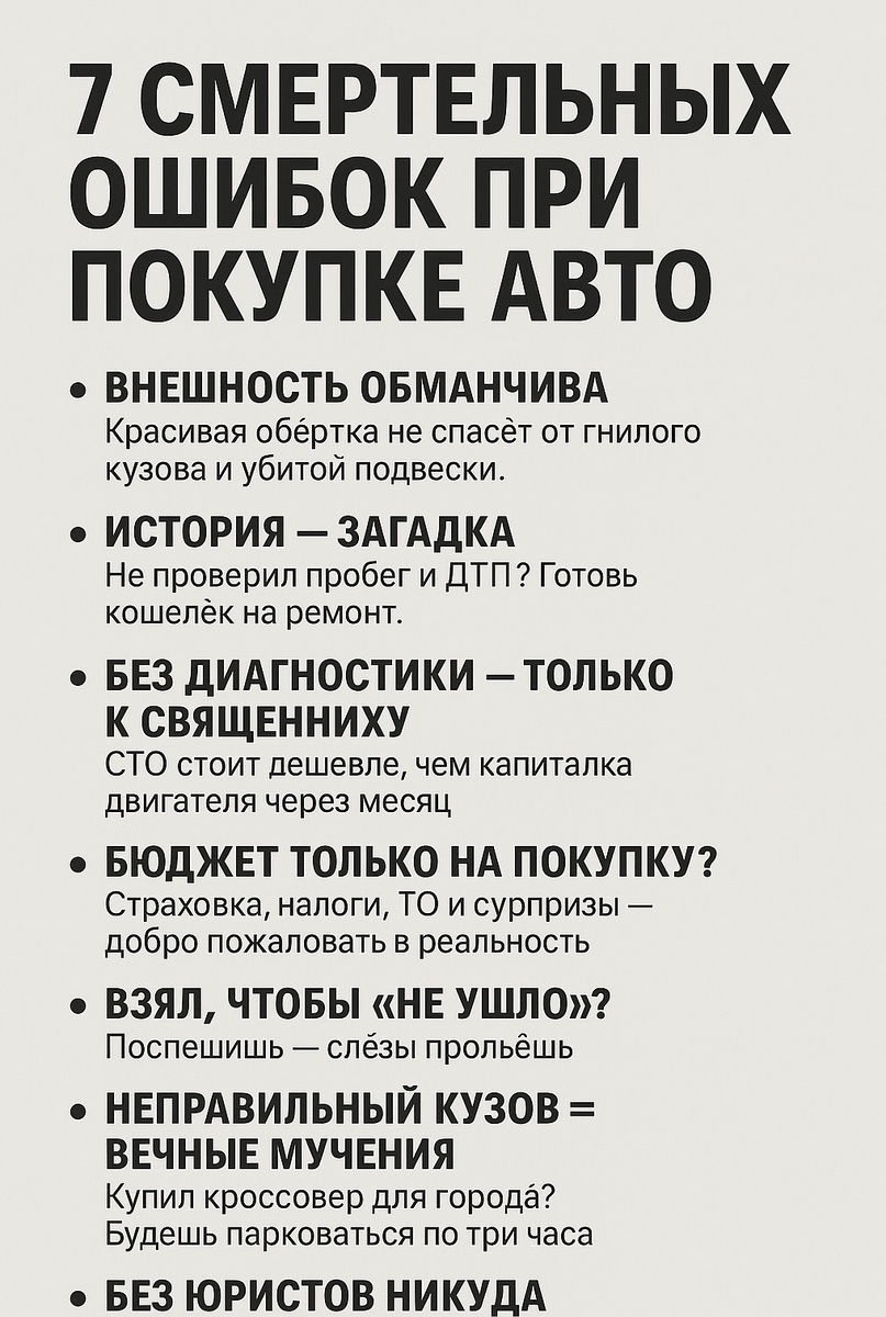 Покупка машины — как игра в русскую рулетку. Ошибёшься — потеряешь деньги, время и нервы. Вот главные ловушки: 1. Внешность обманчива Красивая обёртка не спасёт от гнилого кузова и убитой подвески. 2. История — загадка Не проверил пробег и ДТП..? Готовь кошелёк на ремонт. 3. Без диагностики — только к священнику СТО стоит дешевле, чем капиталка двигателя через месяц.. 4. Бюджет только на покупку..? Страховка, налоги, ТО и сюрпризы — добро пожаловать в реальность. 5. Взял, чтобы "не ушло"? Поспешишь — слёзы прольёшь. 6. Неправильный кузов = вечные мучения Купил кроссовер для города..? Будешь парковаться по три часа. 7. Без юристов никуда Залог, запрет на регистрацию — и ты просто "покатался" за миллионы. Вывод: Покупка машины — это шахматная партия. Хочешь победить? Ищи, проверяй, думай. В следующей статье расскажу, как выбрать правильный автомобиль. Подпишись, чтобы не пропустить.. #авто #покупкаавто #ошибкиавтовладельцев #советы #автоподбор #б/уавто #автомир #автоконтроль