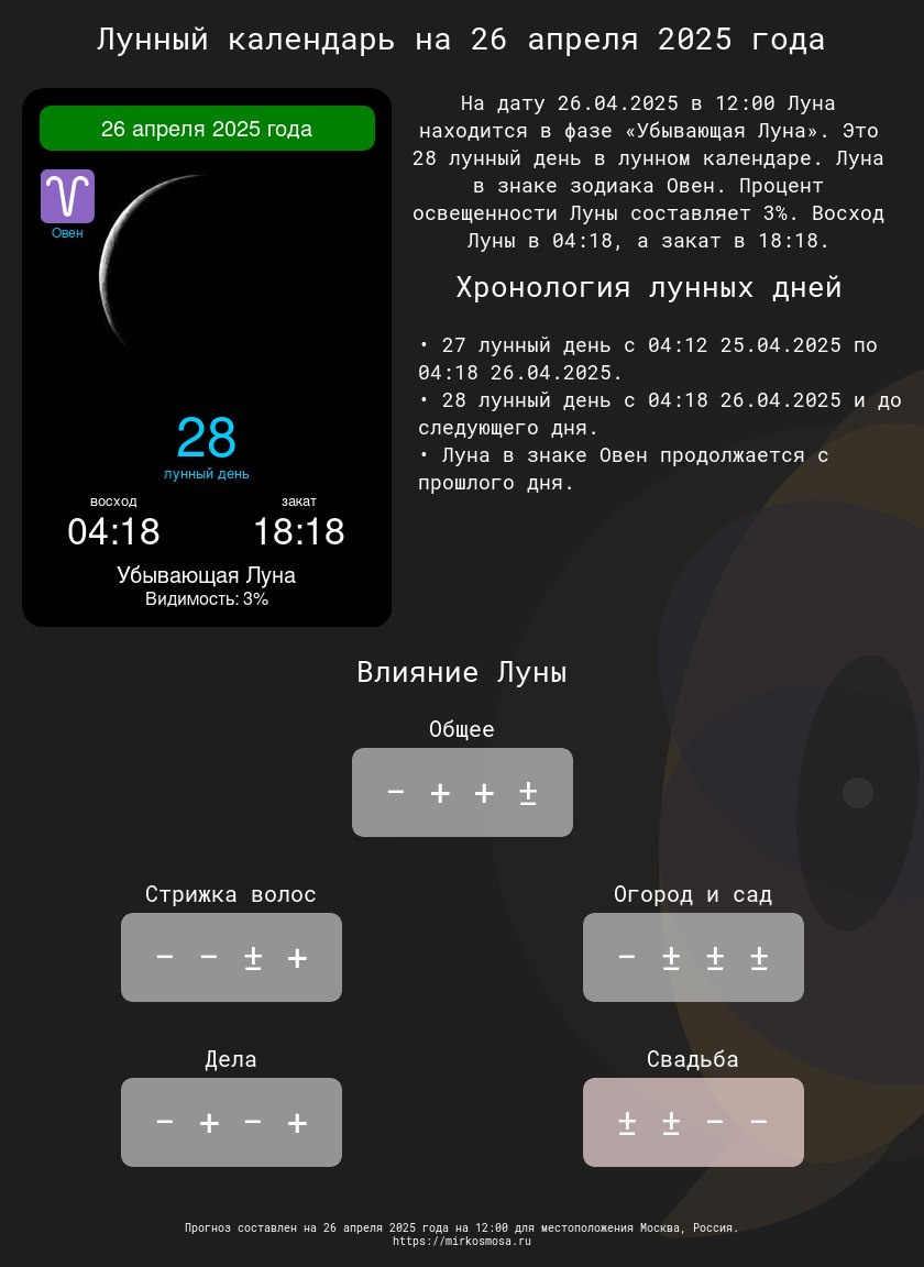 Лунные календари на 26 апреля 2025 года: Подготовьтесь к этому дню с учетом влияния Луны! 🔹🌗 Лунный календарь на 26 апреля 2025 года — Что приготовила Луна? Подробнее 🔹✂️ Лунный календарь стрижек на 26 апреля 2025 года — Подходящий ли день для обновления прически? Подробнее 🔹🌱 Лунный календарь огородника и садовода на 26 апреля 2025 года — Лучшее время для ухода за растениями. Подробнее 🔹📅 Лунный календарь дел на 26 апреля 2025 года — Удачные моменты для важных задач. Подробнее 🔹💍 Лунный календарь свадеб на 26 апреля 2025 года — Подходит ли этот день для вашего торжества? Подробнее