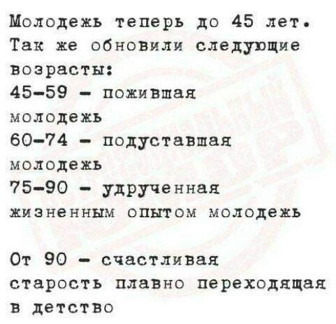 Хахаха. Одногруппники, с которыми 25 лет назад я получала МВА, решили меня морально поддержать и прислали эту картинку. Авторство новой возрастной периодизации мне не известно, к сожалению. Комментарий от друзей был следующий: "Аня, наслаждайся, ты в категории "пожившая молодёжь"! Жизнь продолжается!)" Это была реакция на мое сообщение, что в этом году я стану 60+ и с меня взятки гладки😄 В том смысле, что если меня кто-то на фото не узнает, это не моя проблема, а проблема смотрящего😄 Так я борюсь с селф-эйджизмом. И тут кстати попалась цитата из дневника Льва Толстого: "Мысли о приближающейся старости мучают меня. Смотрюсь в зеркало по целым дням" (1858 год, 18 февраля 29 лет) (из канала Лев Толстой. Лайфстайл) Интересный способ преодоления селф-эйджизма был у писателя. А Вы как боретесь с печалью по поводу своего взросления? Пишите в комментариях. И ставьте минимум три разные реакции, если Вы молоды душой и у Вас все хорошо.😍 🌅 Карьера 50+ и Трансформация #эйджизм #отавтора
