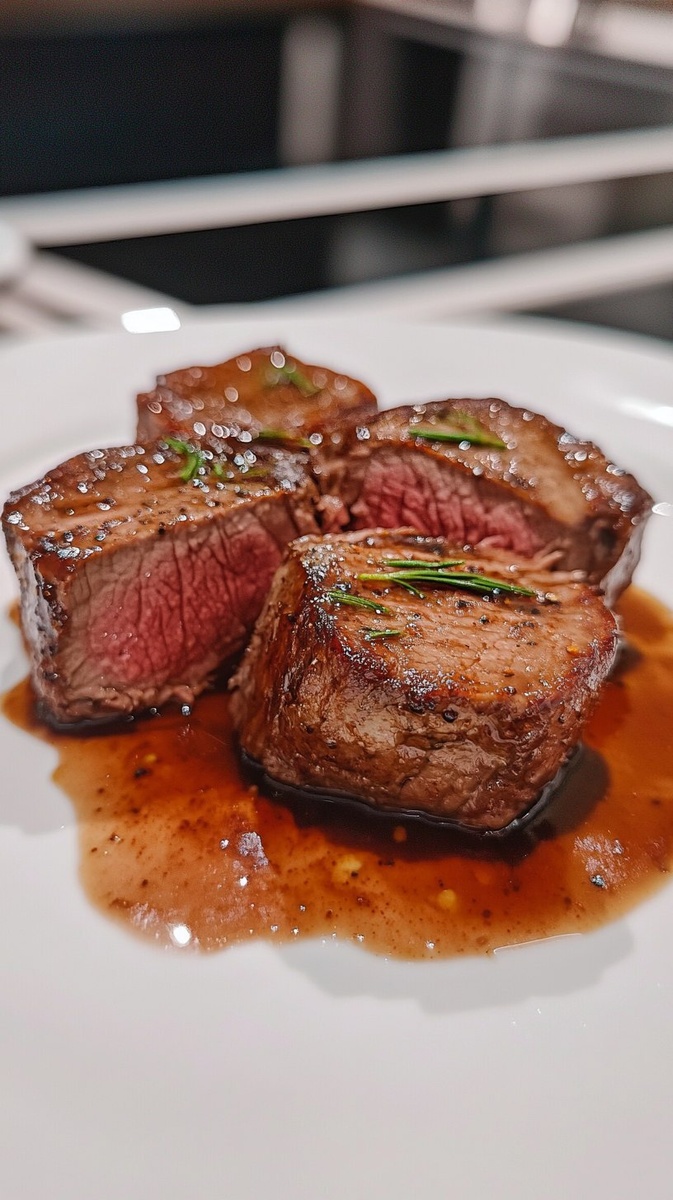 Создано на основе запроса: Title: Lamb Loin Roast | Close-up Shot right view, taken by a photographer with a high quality camera, served on a white plate, background of kitchen, very tasty, delicious, homemade, without any text, words or writing