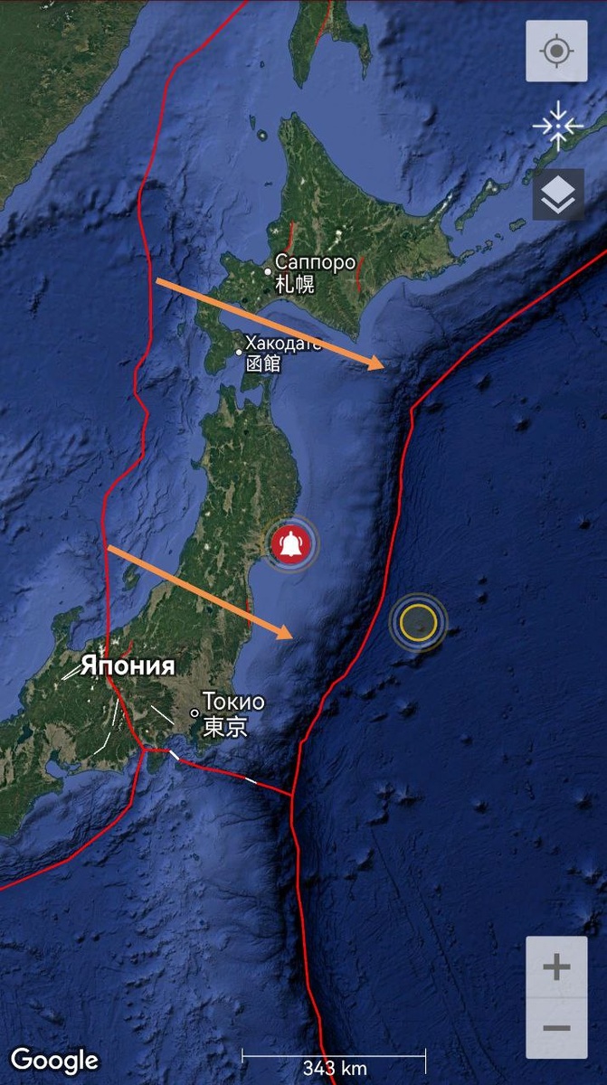 У северной части Хонсю в течение 9 дней сохраняется вероятность землетрясения М7+ в связи с попытками вращения Охотской плиты по часовой