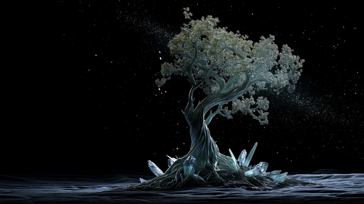 Создано на основе запроса: the first tree on a comet, twisted ice white trunk, delicate ghost green blossoms fluttering in the vacuum of space, roots piercing frozen crystals of starlight, floating in a black void, ethereal dreamscape, cinematic realism, soft cosmic lighting