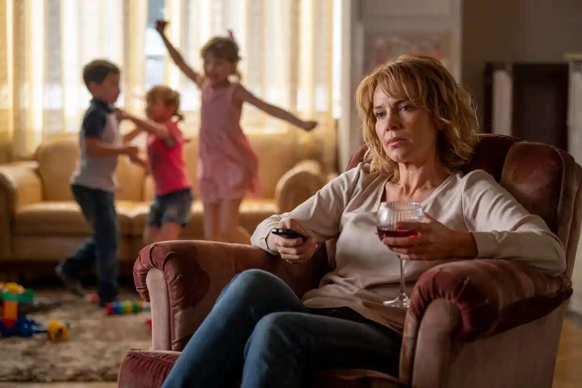 В комнате позади женщины играл телевизор — на экране крутили очередной сериал. На столе стояла коробка из-под пиццы, рядом — бутылка белого вина и почти пустой бокал. Где-то сбоку покачивался автоматический шезлонг, в котором лежал младенец, уставившись в потолок.
