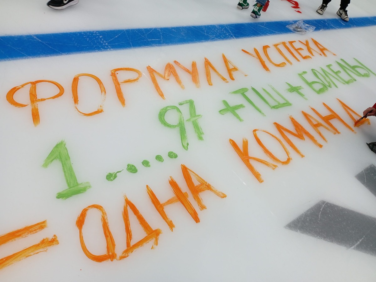 После традиционного барабана команда ушла в раздевалку, а болельщикам предложили поставить яркую точку, — разрисовать и расписать лед на G-Drive Арене. Сказано – сделано.