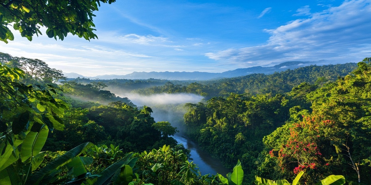 Создано на основе запроса: a heavenly and mysterious tropical rainforest with lush greenery, a gentle river flowing through the center, blue