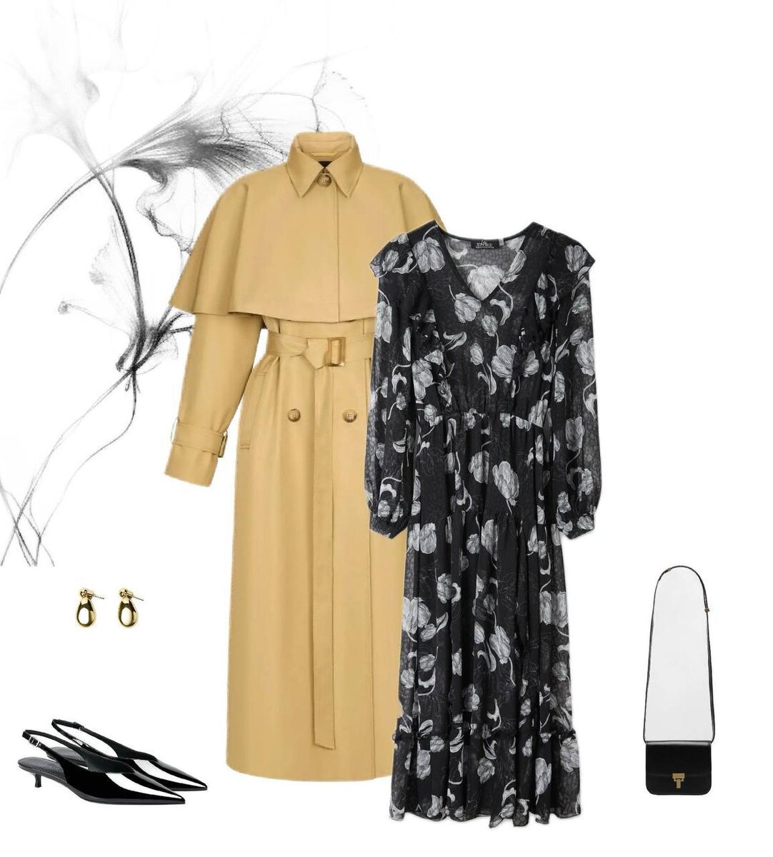 Цветочные платья, струящиеся силуэты, рюши, бохо-настроение, снова на пике моды. Стилизуем наше цветочное шифоновое платье с рюшами в черном цвете 🤍 1 образ Платье Тренч Обувь Сумка Серьги 2 образ Платье Жакет Туфли Сумка