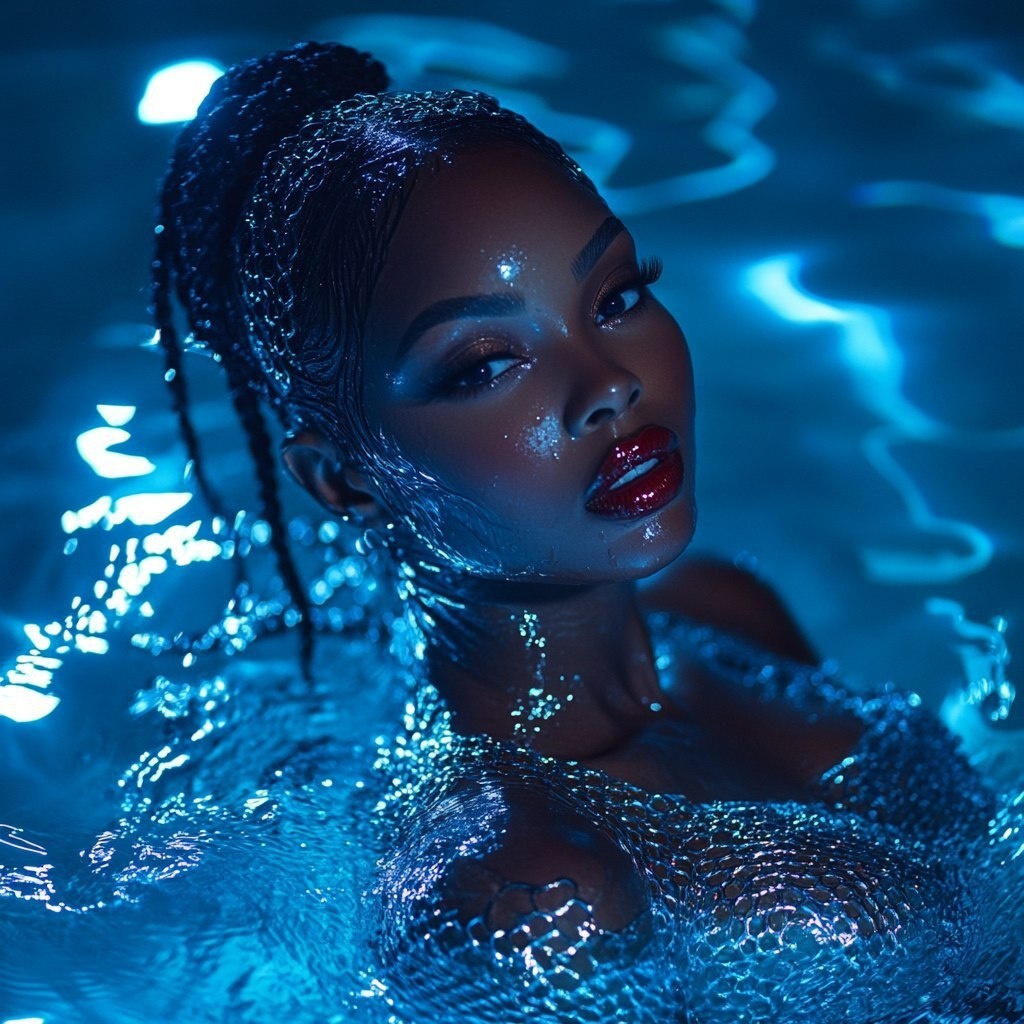 Создано на основе запроса: a stunning Black model immersed in a glowing blue pool, wearing a silver chainmail bodysuit that reflects the water light, her skin radiant and glossy, wet slicked hair or braided crown, dramatic red lips and intense eye contact, photographed at night with high-gloss editorial lighting, sharp shadows and luminous ripples, cinematic beauty photography --- Автоперевод: Потрясающая черная модель, погруженная в светящийся синий бассейн, одетый в боди серебряной цепи, которая отражает свет воды, ее кожу сияющую и глянцевую, мокрые скользящие волосы или плетеная корона, драматические красные губы и интенсивный зрительный контакт, сфотографированные ночью с редакцией с высоким уровнем глосса Как тебе эта картинка? 🤔 https://dzen.ru/id/65c0c65c86e4f837c27b24d7 #ИИ #AI #нейросеть #midjourney #art