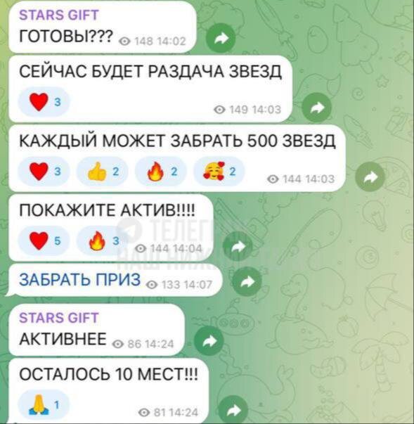 Новый вид мошенничества: бесплатные звезды в Телеграм Злоумышленники создают подставные каналы и публикуют посты с предложением якобы получить бесплатные звезды — для этого нужно перейти по ссылке и отправить имя пользователя и номер телефона для отправки кода. Затем на указанный номер приходит сообщение из WhatsApp*— так они пытаются украсть аккаунт. С него они могут как получить доступ к другим соцсетям, так и писать от вашего имени вашим контактам с просьбой прислать деньги, шантажировать вас вашими переписками или подвести вас под уголовку: например, рассылая призывы к терроризму от вашего имени. Не ведитесь и отправьте близким 👆 * принадлежит Meta, признанной экстремистской и запрещенной на территории РФ