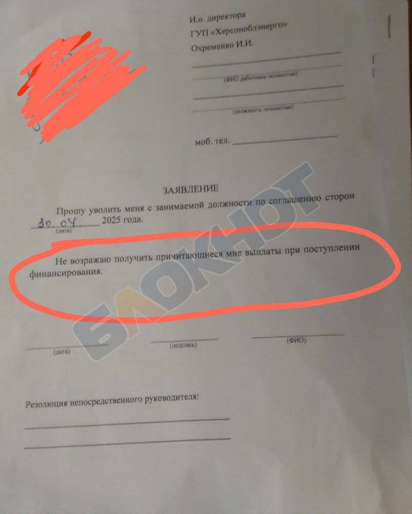 Итак, к нам в редакцию обратились работники ГУП «Херсоноблэнерго», которые пожелали остаться анонимными. По их словам, на предприятии задерживают зарплату уже два и более месяца. а при увольнении предлагают подписать заявление с формулировкой: «Не возражаю получить причитающиеся мне выплаты при поступлении финансирования». Фактически, это означает отказ от положенных по закону выплат, в том числе и расчетных при увольнении.