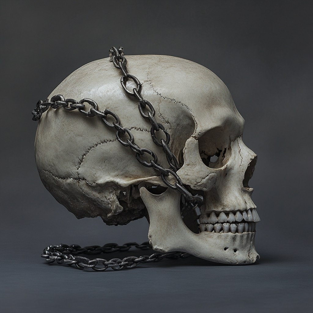 Создано на основе запроса: human skull, side view, chain flowing through eye socket, dark gray background, dramatic