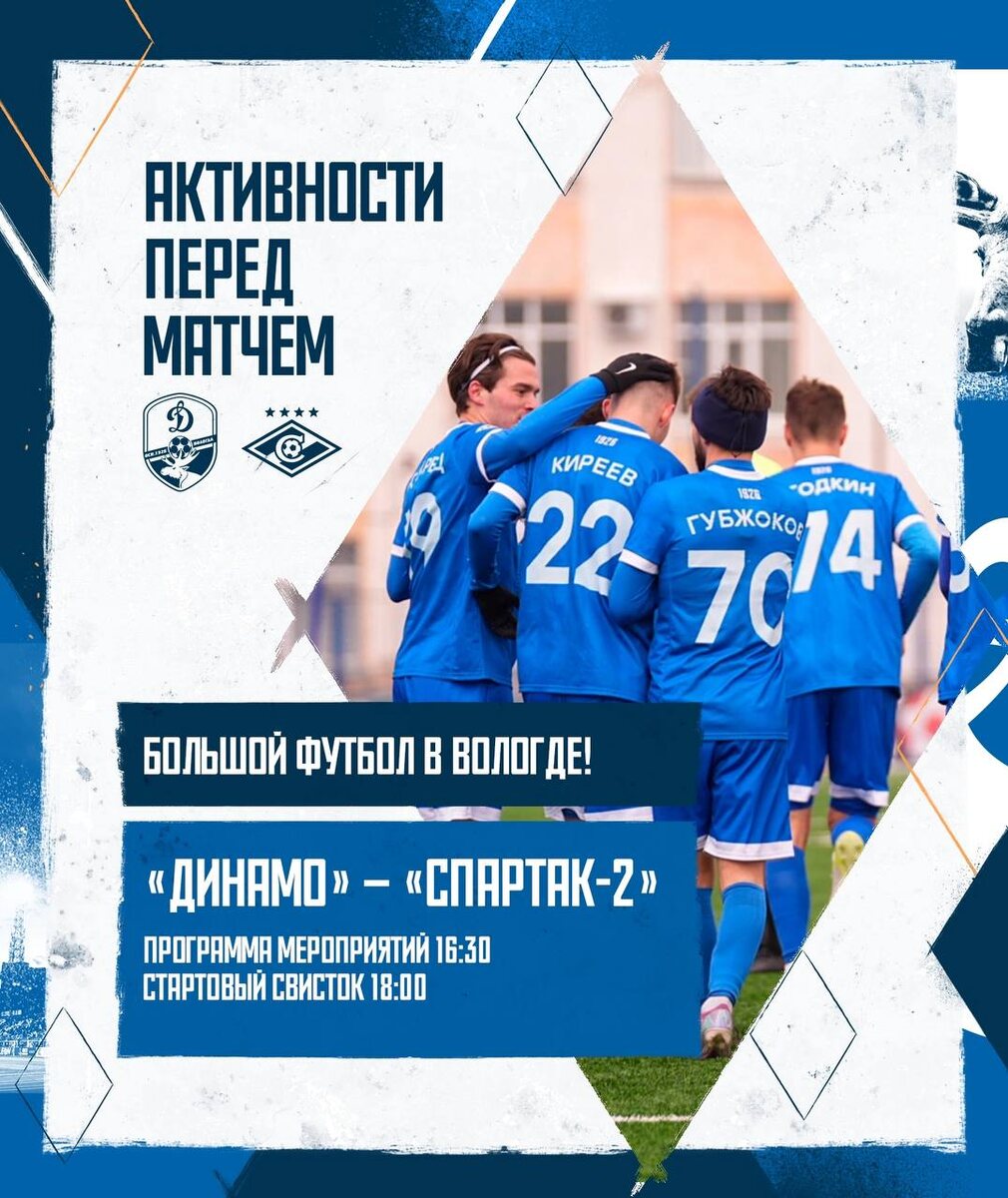 Большой футбол на «Динамо»: в воскресенье встретимся со «Спартаком-2» ⚪️🔵 Множество активностей и принципиальное противостояние на футбольном поле — именно это ждёт нас 🔥 ❕Внимание! Вход на стадион будет открыт в 16:30. @dynamovologda