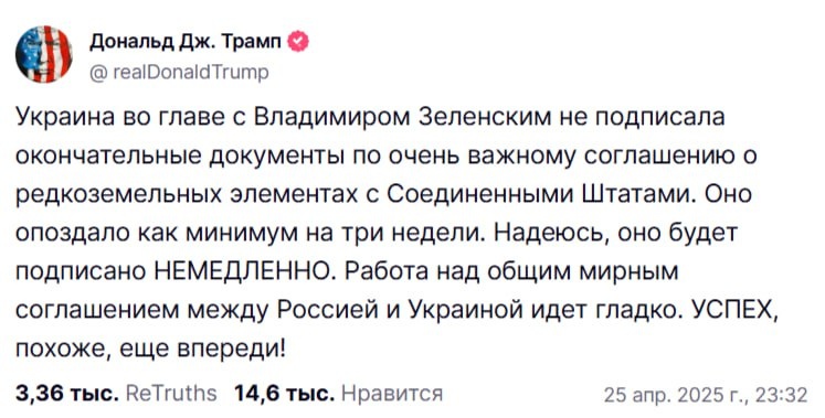 В первом сообщении Трамп вновь показывает, кто виноват в затягивании мирного процесса. Уже неоднократно писал, что состояние «сделки по недрам» США и Украины - это маркер того, что США остаются в мирном процессе или выходят из него. В Рим от России полетела министр культуры Ольга Любимова, соответственно 3-х сторонней встречи не будет. Британская The Times, со ссылкой на человека близкого к Уиткоффу, сообщает, что Трамп намерен позволить России сохранить контроль над занятыми территориями - этот план «высечен на камне». Трамп настаивает на реализации плана урегулирования конфликта на Украине, который подготовила его команда. У Зеленского «просто нет выбора», кроме как согласиться, добавил источник. Давление на Зеленского в этом ключе нарастает, отметил он. Не попробовав надавить на Зеленского, Трамп из процесса не выйдет.