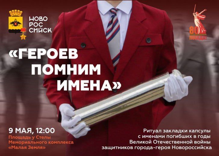 9️⃣ МАЯ 🧡В городе-герое Новороссийске пройдёт военно-патриотическая акция «Героев помним имена» 🎗🎗🎗🎗🎗🎗🎗🎗🎗🎗🎗 Состоится ритуал закладки капсулы с именами воинов, останки которых были найдены в ходе работ поисковых отрядов. Мероприятие начнется в 12:00 на площади у стелы мемориального комплекса «Малая Земля». В рамках военно-патриотической акции «Героев помним имена» в Новороссийске 43 года подряд пополняются списки с именами героев, отдавших свои жизни за Родину в ожесточенных боях на Малой земле. 🌺Этот ритуал – важный шаг к сохранению исторической правды и памяти о героях. Уважаемые жители и гости города-героя Новороссийска, давайте присоединимся к этому важному событию.